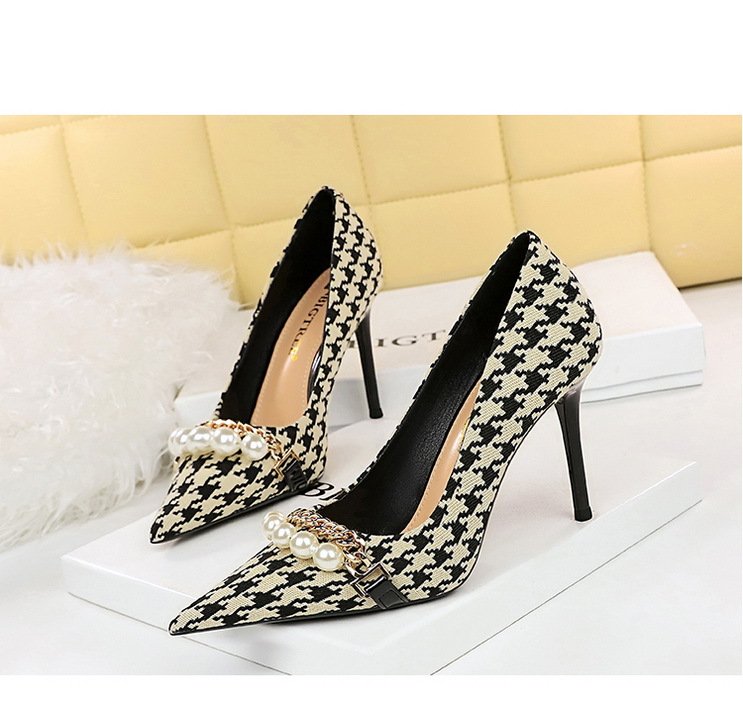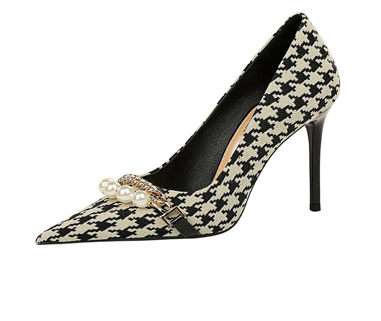 9283-1 Wind Thousand Bird Plaid High Heel Shoes Thin Heel High Heel Shallow Mouth Pointed Pearl Chain Plaid Women's Single Shoes