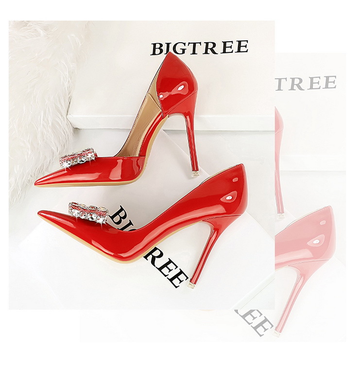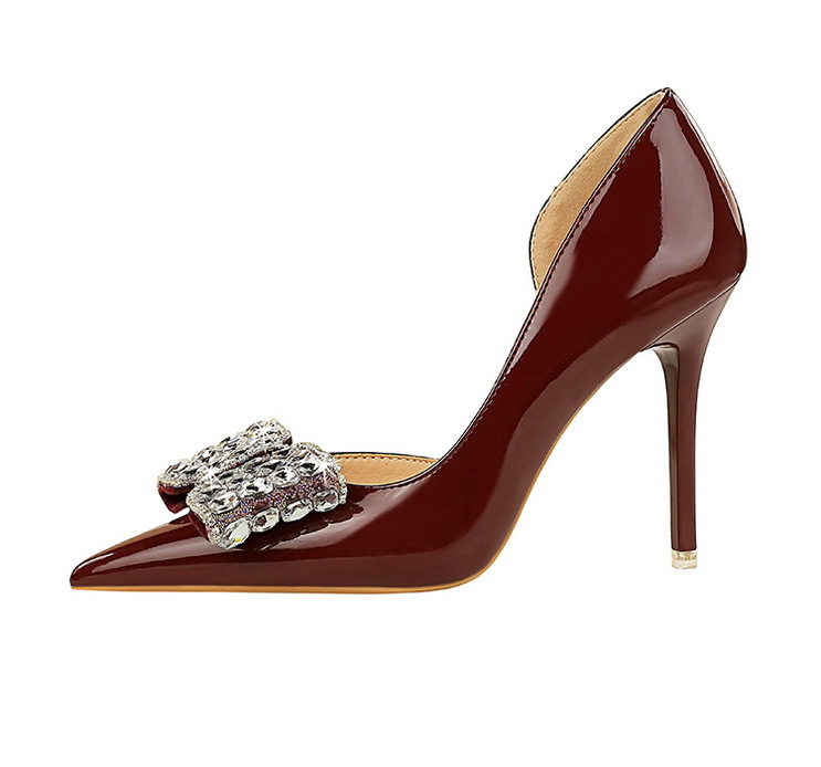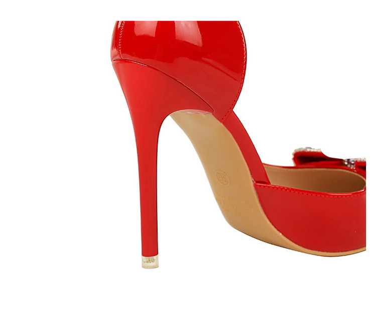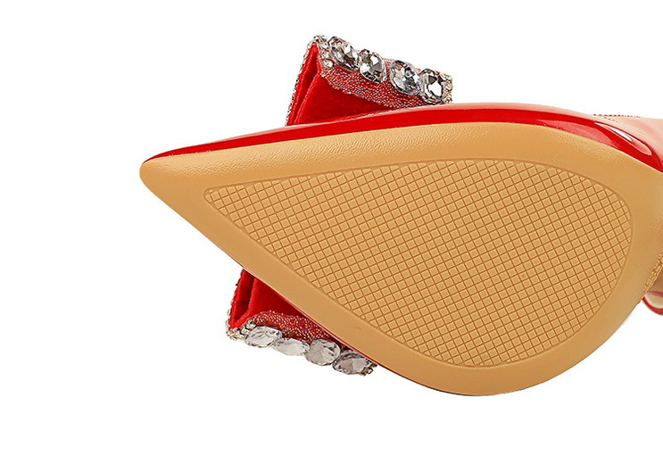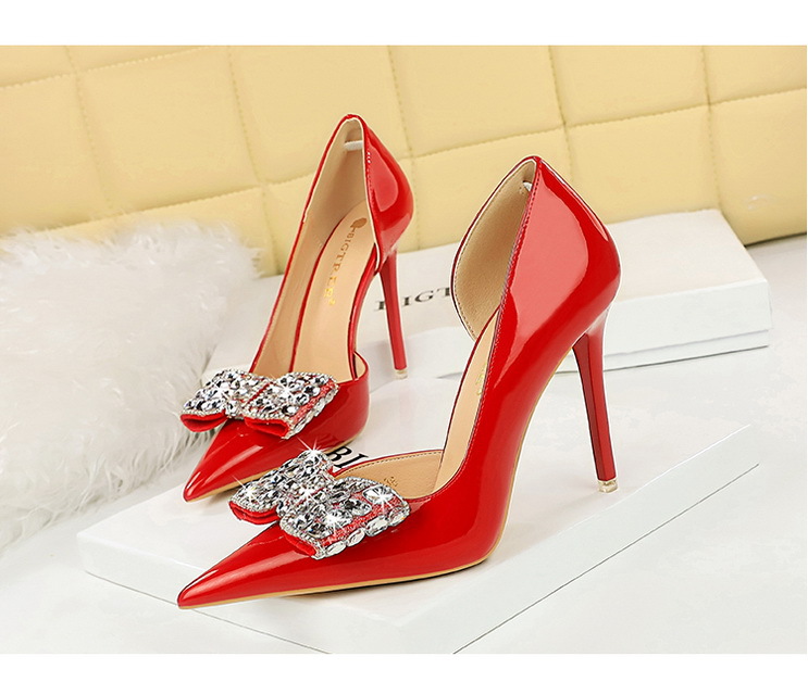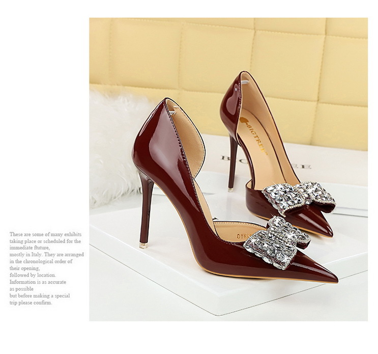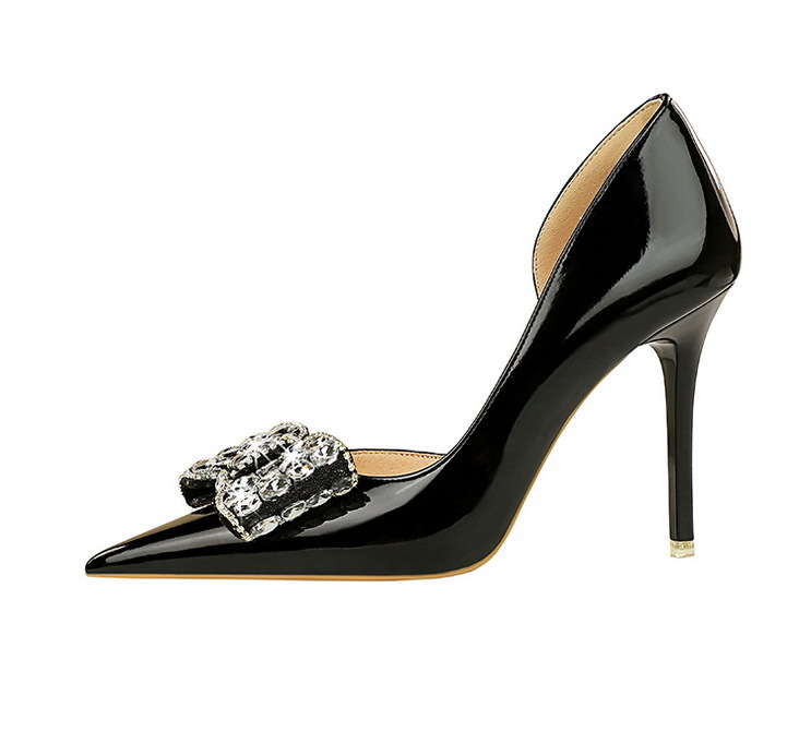 638-H20 Banquet High Heels, Thin Heels, Shallow Notch, Pointed Side Hollow Lacquer Leather, Rhinestone, Bow Tie, Single Shoe, Female